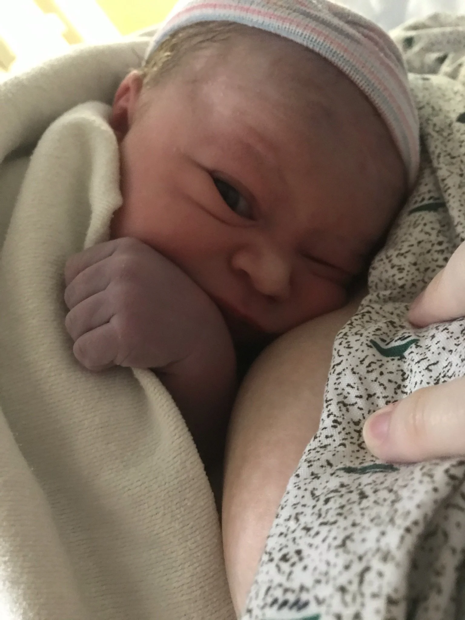She let out a quick little shriek, then promptly fell back to sleep on my chest. JoAnn tried to convince me that she had given me “all the hell she was going to” now that she had finished out the world’s most miserable pregnancy with thrashing her way through my pelvis and settling peacefully on my chest. I can tell you over a year later her favorite way to wake me up in the morning is still with a swift little headbutt. I got the perfect “Golden Hour” this time around and for two hours, she never left my chest – not even for a diaper, which I suppose makes me brave😉. Eventually she was taken to the warmer next to me for a weight and a small assessment. At 8lbs 4oz, she was my peanut. She had some significant bruising on her forehead from the sunny side up position she arrived in. You can tell that she had her brow furrowed when she was head banging her way out by the stripe pattern of the bruises. We started breastfeeding right away and were quite successful. Stay tuned for my postpartum story that includes how I navigated feeding a newborn a full milk supply (I was still nursing my toddler). There’s a lot of spit up in that story.